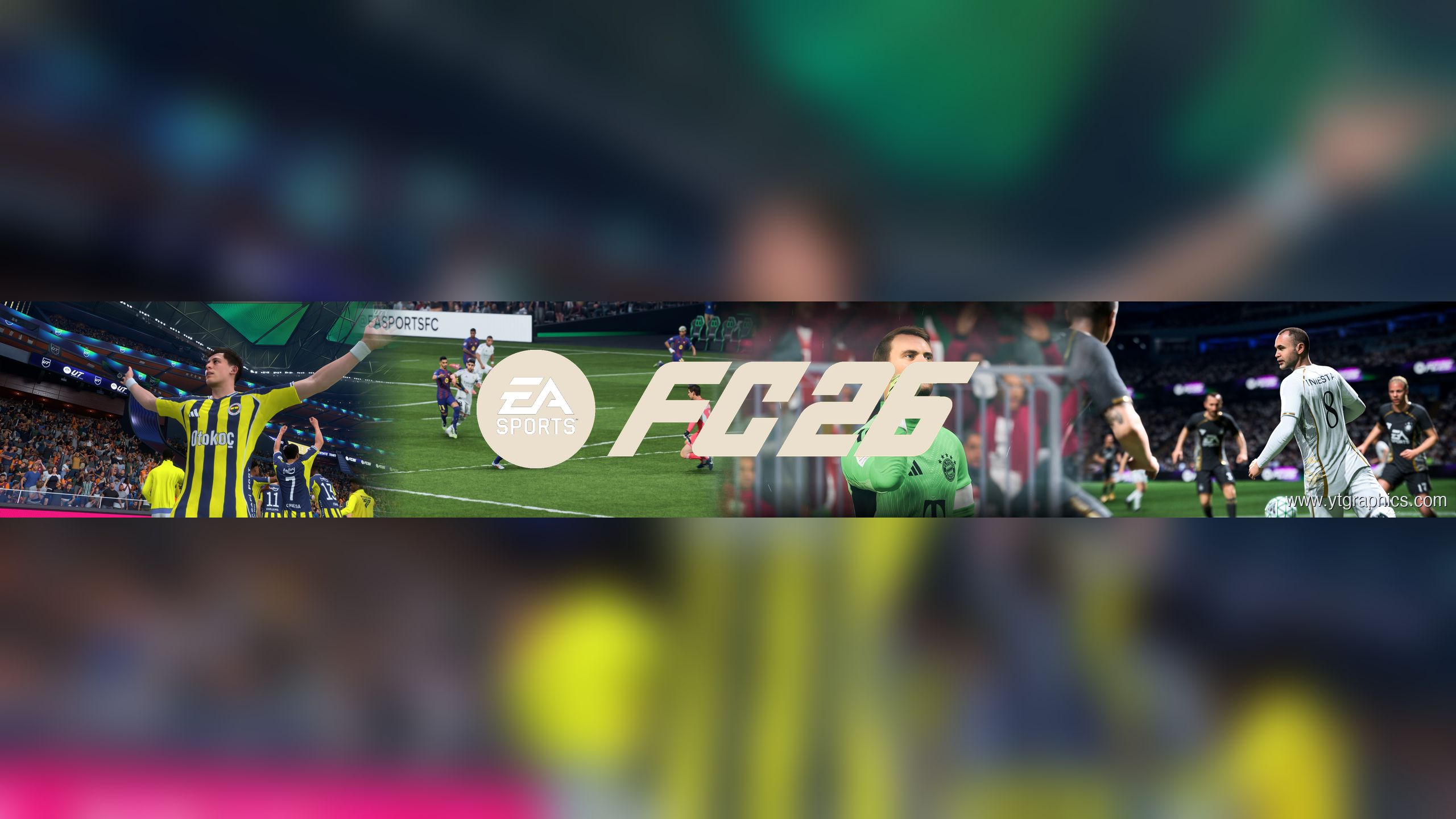 This professionally designed YouTube banner for EA SPORTS FC 26 features high-quality gameplay screenshots showcasing the game’s stunning visuals and immersive football action. The banner is optimized for YouTube’s 2560×1440 pixel dimensions with the EA SPORTS FC 26 logo prominently displayed in the center. Perfect for gaming channels focused on football games, sports simulations, or EA SPORTS content, this banner combines vibrant in-game imagery with a clean, professional layout that looks great on all devices.