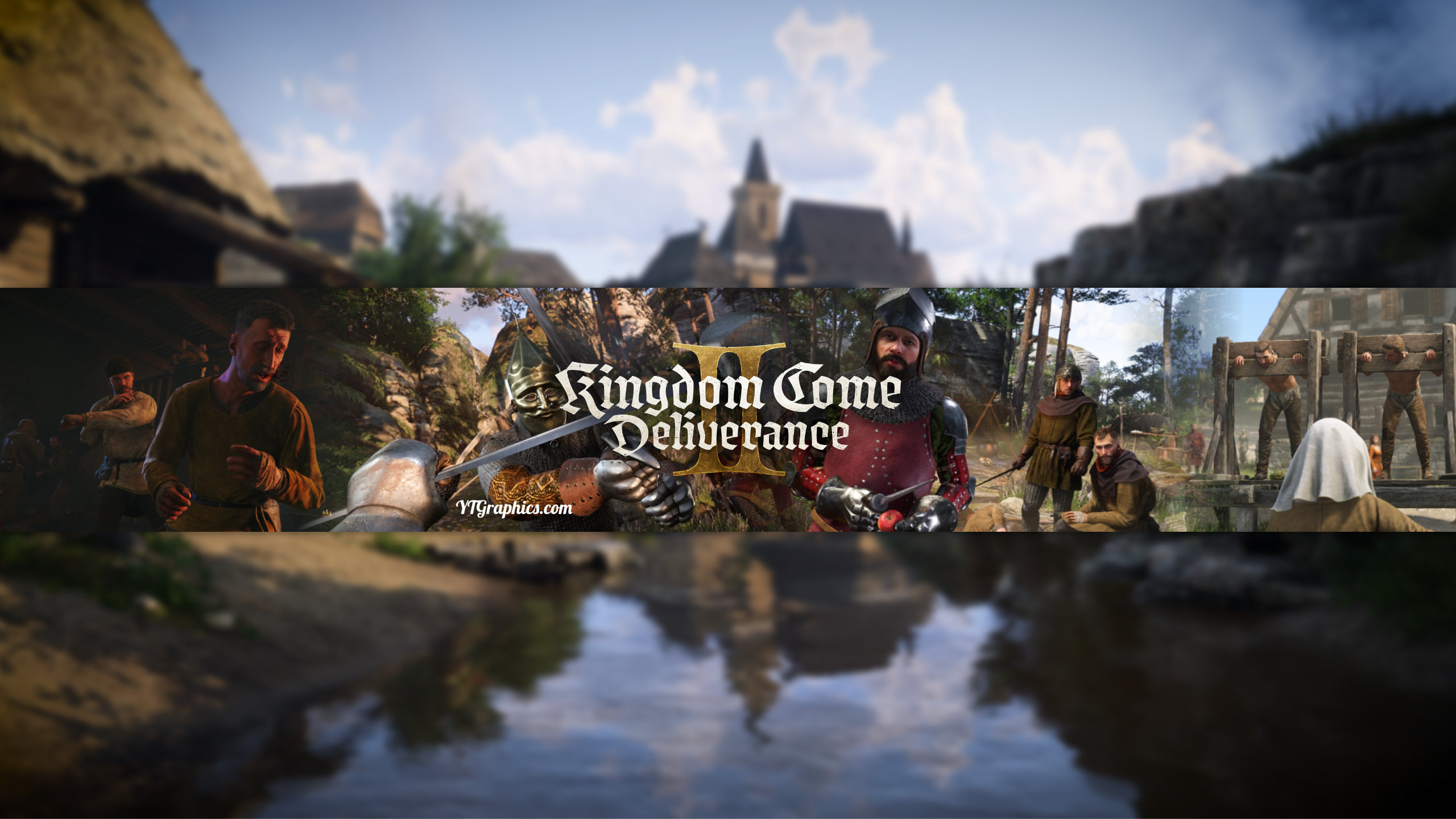 This is a YouTube banner for the video game "Kingdom Come: Deliverance." The banner features a medieval-themed collage showing various scenes from the game, including armored knights, peasants, and a monastery or church in the background. The game's title appears in gothic-style text in the center, with images reflected in water at the bottom of the banner. The composition uses a mix of dramatic lighting and medieval imagery to capture the historical RPG atmosphere of the game.
