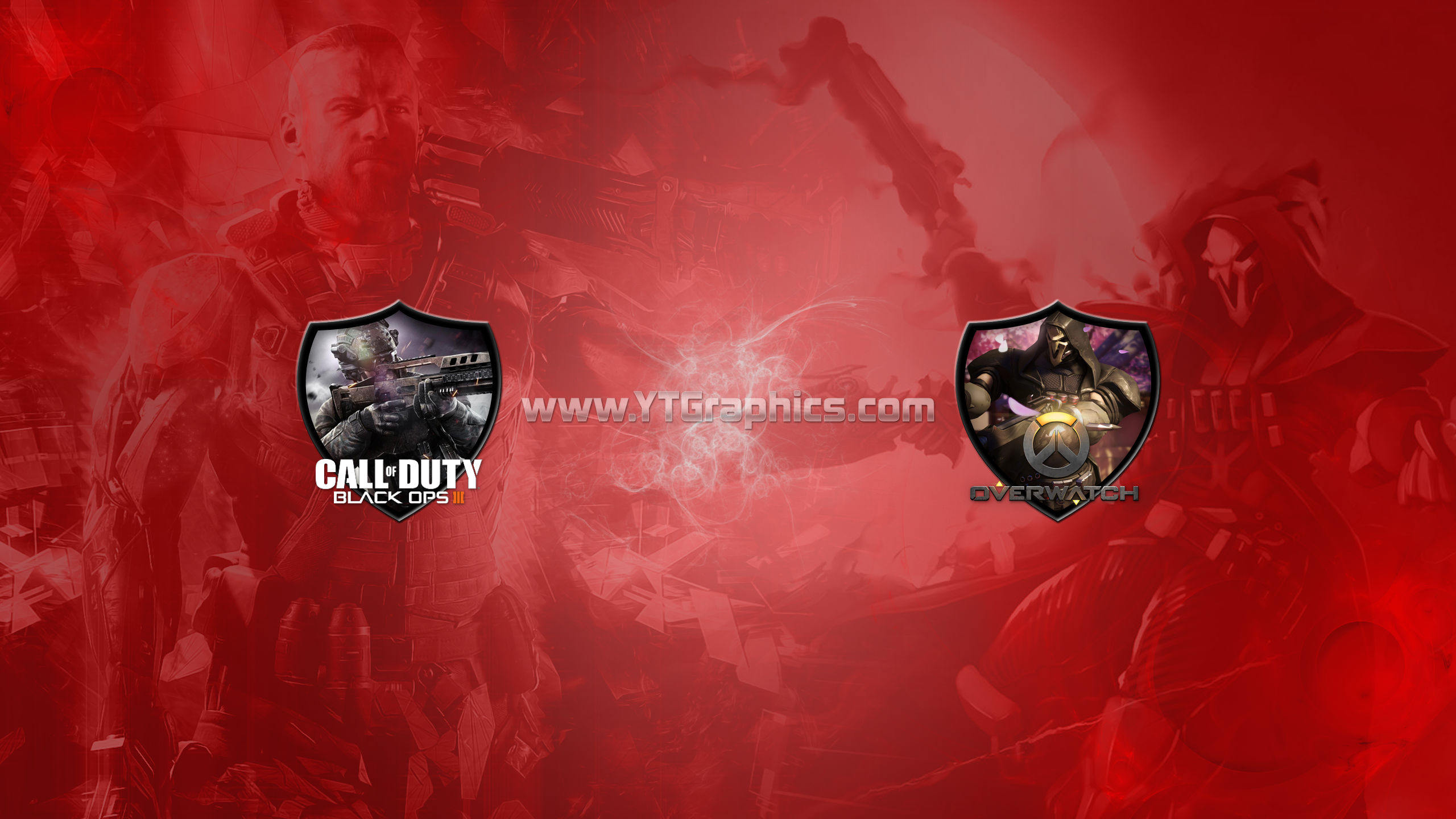 The YouTube channel art banner showcases a stunning combination of two popular first-person shooter games, Black Ops III and Overwatch. In the foreground, a character from Black Ops III is holding a gun while standing against a dark and gritty backdrop. In the background, we see a towering character from Overwatch, glowing with bright energy, and brandishing her weapon. Both characters are backdropped by a futuristic cityscape filled with neon lights, helicopters, and planes. The overall aesthetic of the banner is lively, action-packed, and intense, leaving any gamer excited to explore what the channel has in store for them.
