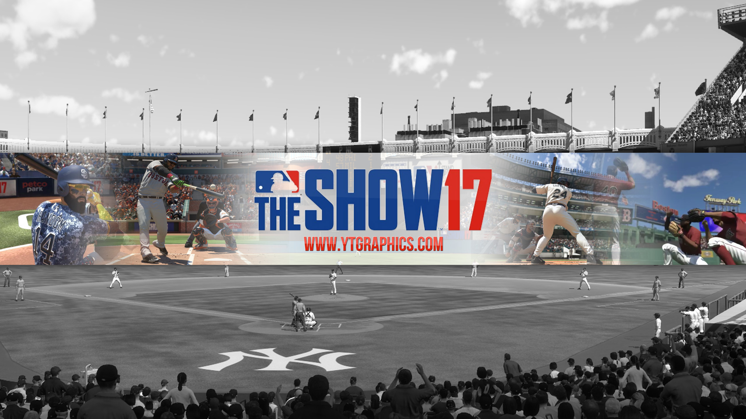 This YouTube channel art banner showcases an eye-catching image of a highly detailed and action-packed baseball stadium scene. In the center, a player stands poised to hit the ball as the pitcher prepares to throw. The crowd fills the stands, cheering and holding up signs. The colors are vibrant and eye-catching, with a mix of greens, blues, and reds. The MLB The Show 17 logo takes center stage, with bold white letters outlined in black on a blue background. Overall, this banner is perfect for any baseball fan or avid player of the game.
