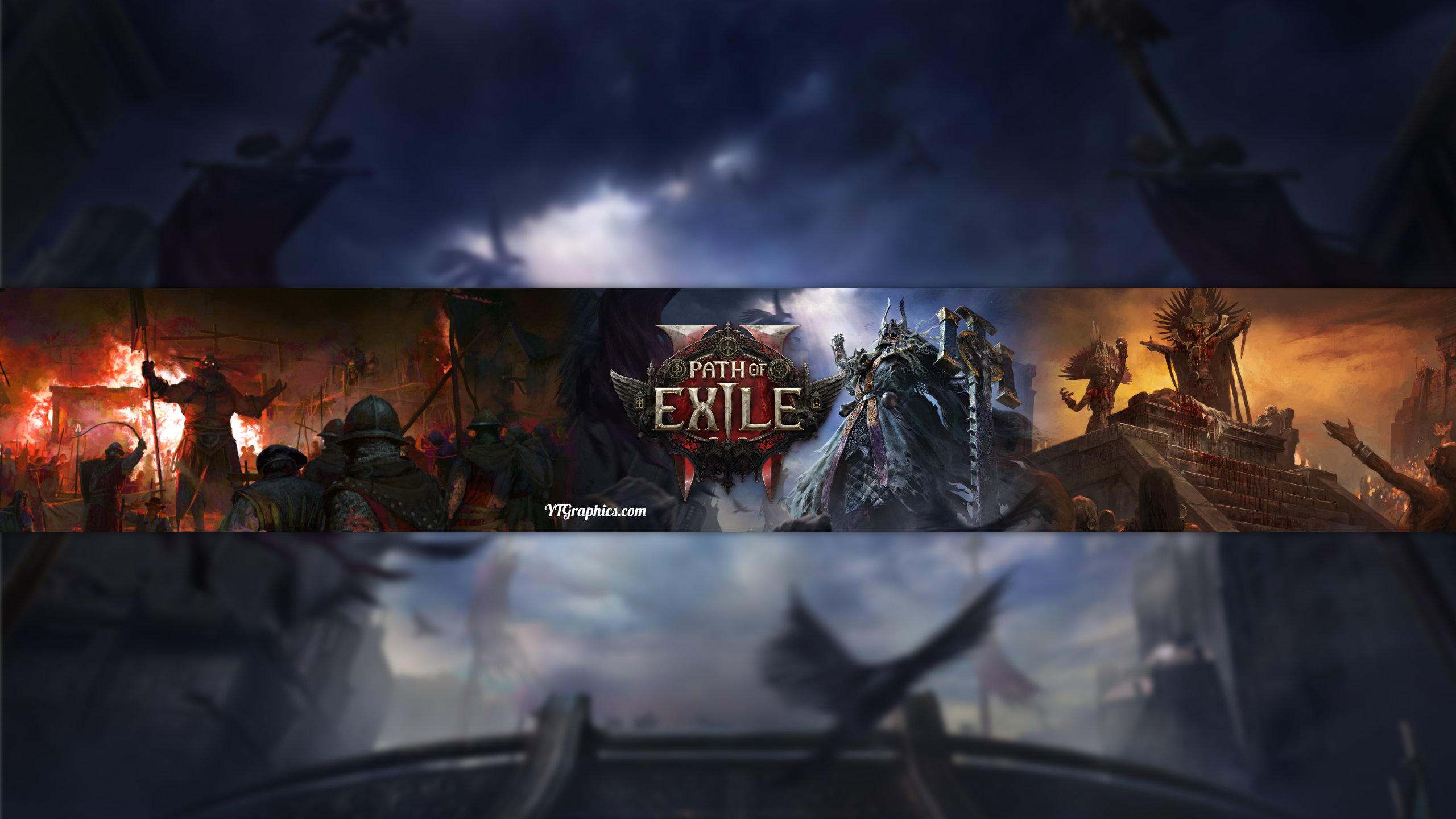 This is a YouTube banner for the game "Path of Exile." The banner is divided into three dramatic scenes: on the left, there's a battle scene with soldiers and flames; in the center, there's an armored figure in regal blue and silver armor against a stormy backdrop with the Path of Exile logo; and on the right, there's a scene featuring an ornate structure or temple with dramatic orange lighting. The overall tone is dark and epic, fitting for the game's dark fantasy theme.