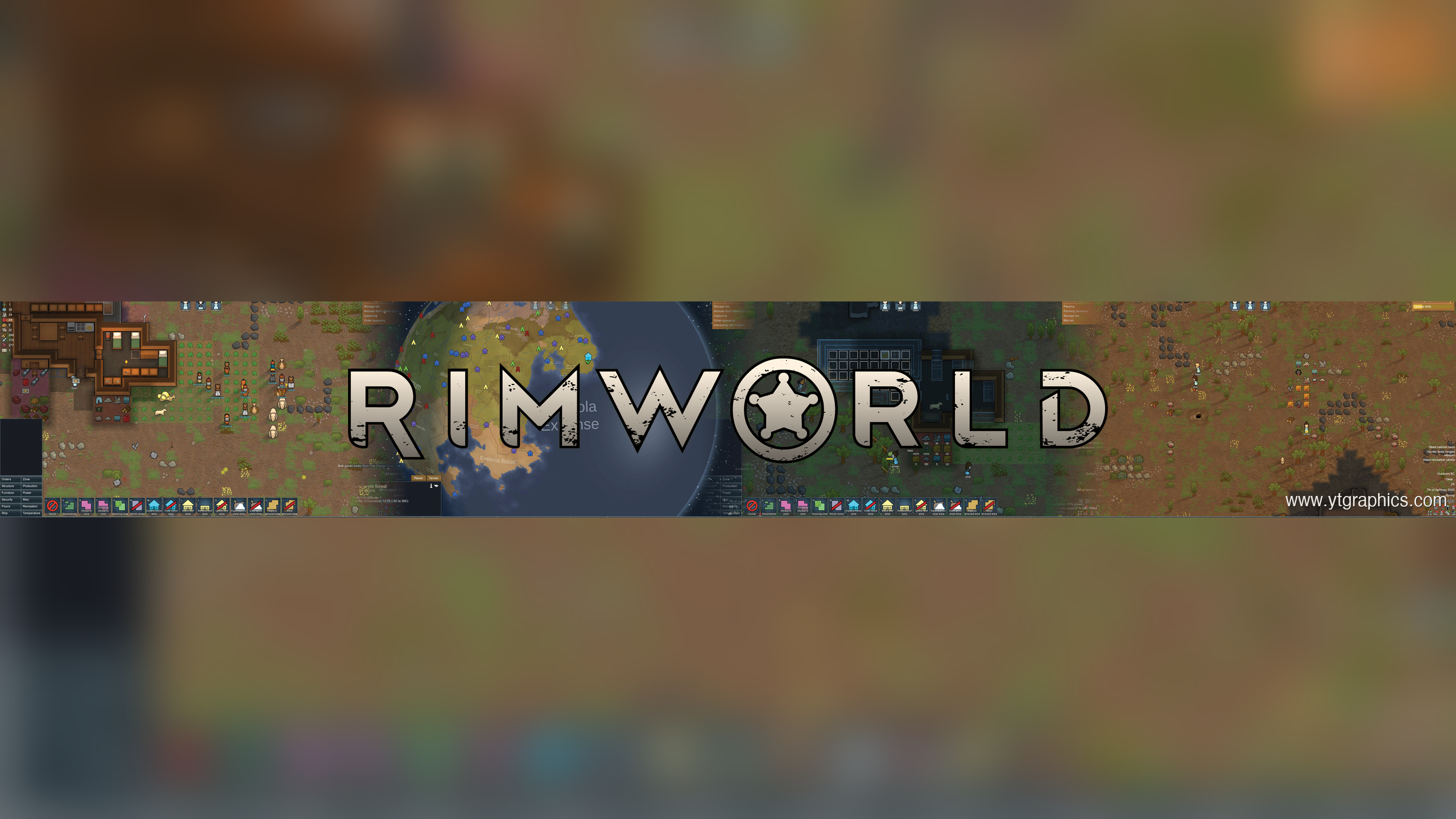 This free RimWorld YouTube banner features a 2560×1440 pixel design showcasing authentic gameplay screenshots including colony building, world map exploration, and open-terrain survival. The official RimWorld logo is prominently displayed across a composited strip of in-game visuals with a softly blurred background, making it ideal for YouTube channels dedicated to RimWorld gameplay, tutorials, colony showcases, and modding content.