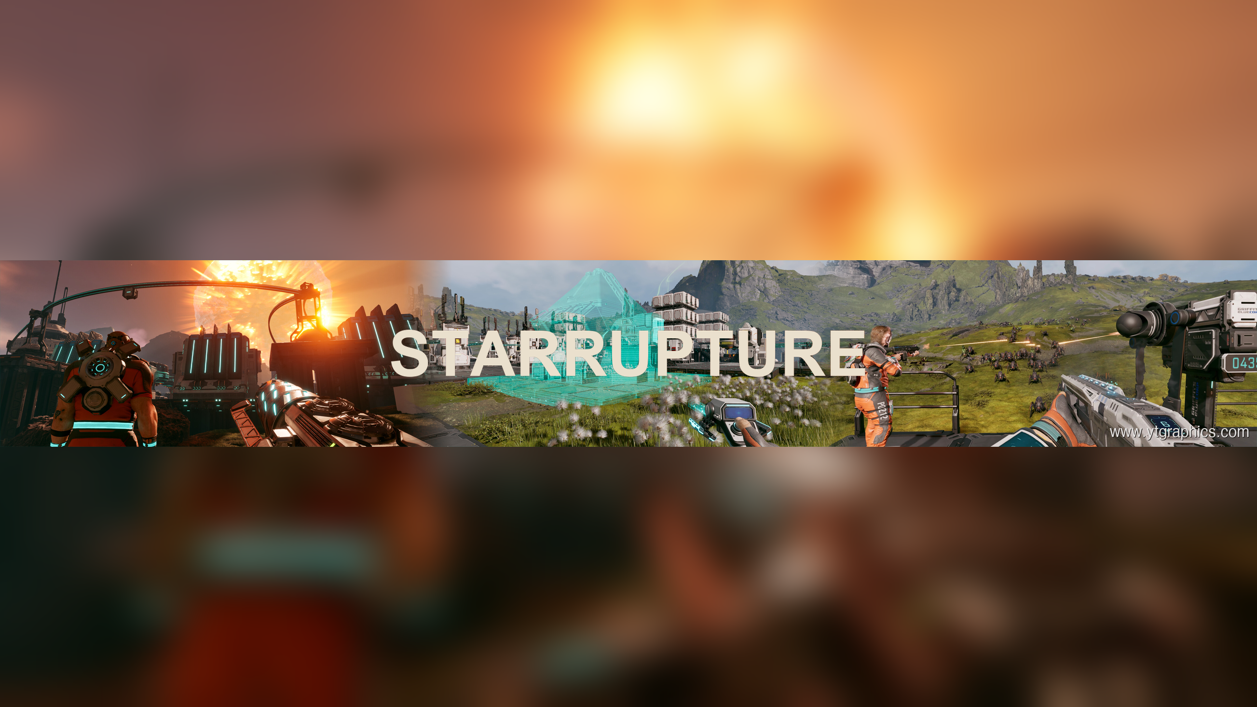 This custom YouTube banner showcases stunning StarRupture gameplay imagery featuring the game’s distinctive cyan-accented industrial aesthetic, dramatic sunset vistas over alien landscapes, and intense combat encounters with hostile creatures. The design highlights the game’s beautiful environments and base-building mechanics with the official StarRupture logo prominently displayed. Optimized at 2560×1440 pixels to meet YouTube’s recommended channel art specifications with proper mobile safe zone coverage, this banner is perfect for gaming content creators, streamers, and YouTubers producing StarRupture gameplay videos, tutorials, base-building guides, and multiplayer adventures.