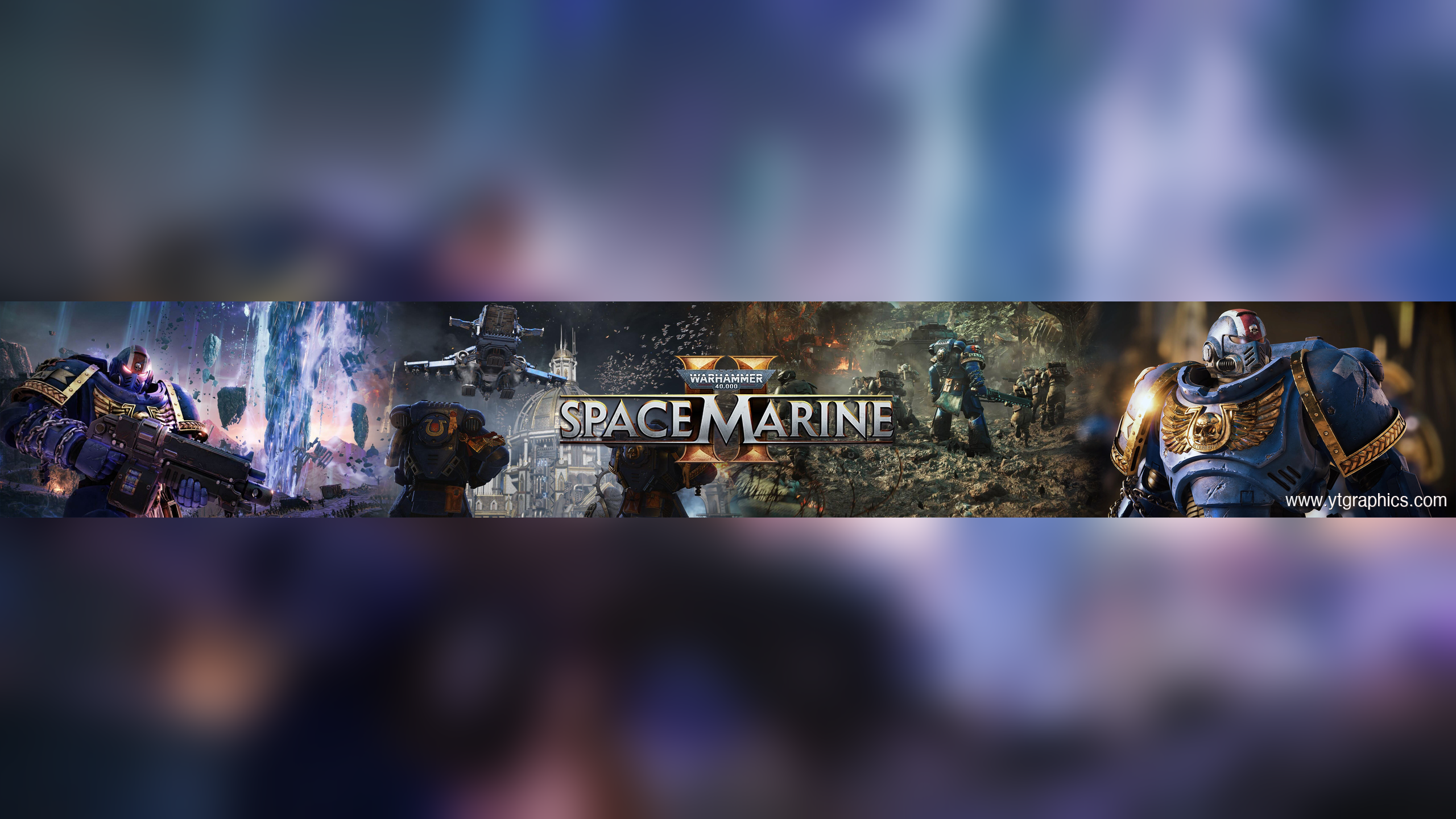 This custom YouTube banner showcases stunning imagery from Warhammer 40,000: Space Marine 2, featuring the iconic Ultramarines in their signature blue power armor amid dramatic battle scenes. The banner displays the official game logo with its distinctive golden column design against a backdrop of Imperial architecture and alien warfare. Optimized at 2560×1440 pixels to meet YouTube’s recommended channel art specifications, this banner is perfect for gaming channels, streamers, and content creators covering Warhammer 40K and Space Marine 2 content.